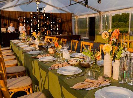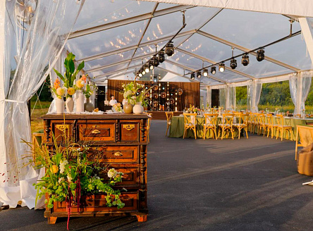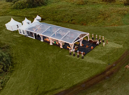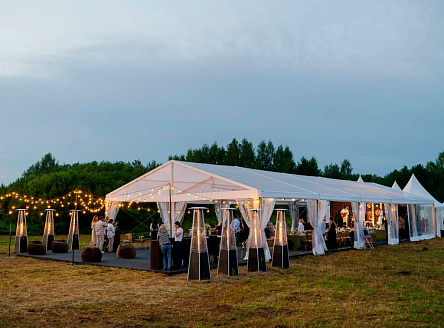 Прозрачный шатёр размером 10×25 метров с высотой стены 3 метра - идеальное решение для стильного мероприятия любого формата. Конструкция обеспечивает комфортное размещение гостей, удобное зонирование и необходимое пространство даже при большом количестве приглашённых. Интерьер этого шатра оформлен легкими драпировками и тёплой гирляндной подсветкой, которая создаёт уютную атмосферу в вечернее время. Высота шатра позволяет свободно разместить декор, световое оборудование и обогреватели, обеспечивая комфорт в любую погоду. Внутри организованы зоны для общения и отдыха, а прозрачные боковые стенки добавляют естественного света днём и создают эффект открытого пространства вечером. Проект демонстрирует, как шатёр может стать полноценной площадкой для проведения вечеринок, корпоративных мероприятий, частных праздников и свадеб - сочетая в себе практичность, эстетику и функциональность.