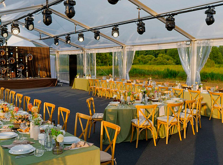 Прозрачный шатёр размером 10×25 метров с высотой стены 3 метра - идеальное решение для стильного мероприятия любого формата. Конструкция обеспечивает комфортное размещение гостей, удобное зонирование и необходимое пространство даже при большом количестве приглашённых. Интерьер этого шатра оформлен легкими драпировками и тёплой гирляндной подсветкой, которая создаёт уютную атмосферу в вечернее время. Высота шатра позволяет свободно разместить декор, световое оборудование и обогреватели, обеспечивая комфорт в любую погоду. Внутри организованы зоны для общения и отдыха, а прозрачные боковые стенки добавляют естественного света днём и создают эффект открытого пространства вечером. Проект демонстрирует, как шатёр может стать полноценной площадкой для проведения вечеринок, корпоративных мероприятий, частных праздников и свадеб - сочетая в себе практичность, эстетику и функциональность.